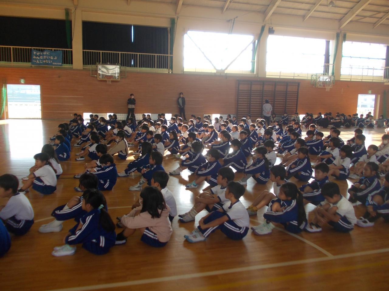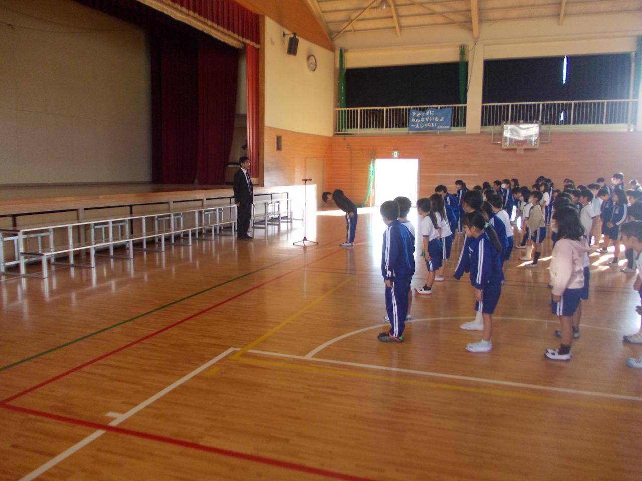始めに全校生で校長先生と元気よくあいさつをしました。児童会につづいて、みんな大きな声でしっかりとあいさつができていました。