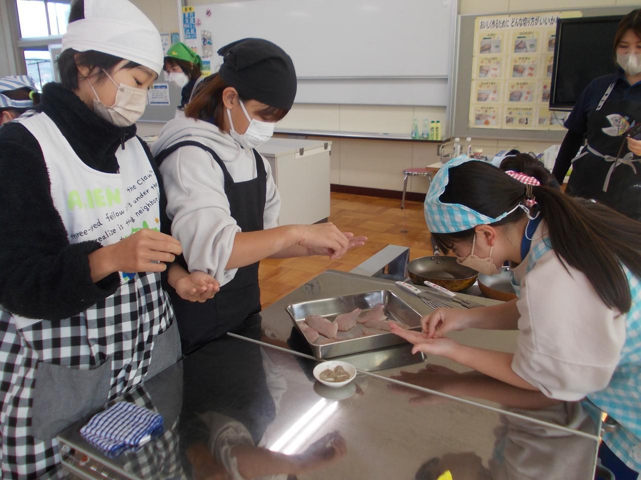 みんな上手に三枚おろしをすることができました。写真はさばいた切り身に塩コショウをしているところです。