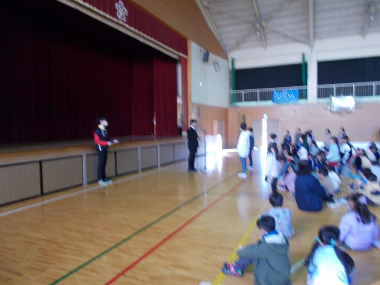 校内持久走大会の表彰がありました。名前を呼ばれた児童は、大きな声で返事ができていました。代表で6年男子と女子が賞状を受け取りました。
