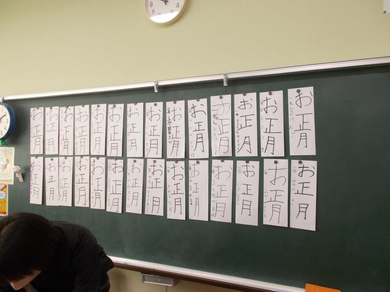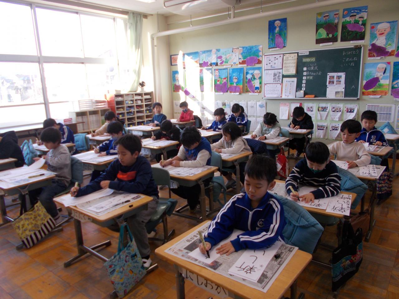 1・2・3年生は教室で書きました。1,2年生は毛筆ではなくマジックチョークで書いています。手本を見ながら集中して書いているところです。