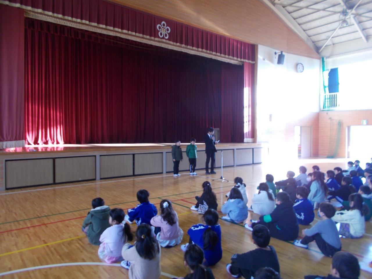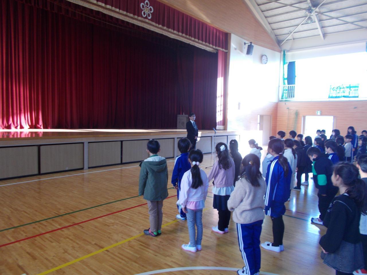 始業式の前に転入生の紹介がありました。1年生と4年生に新しいお友達が加わりました。