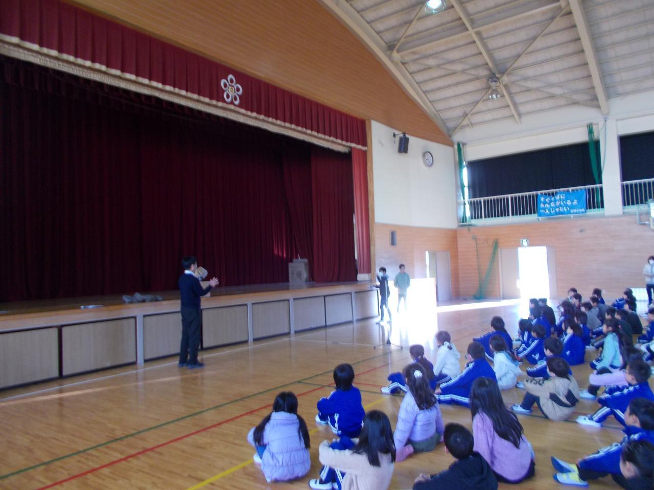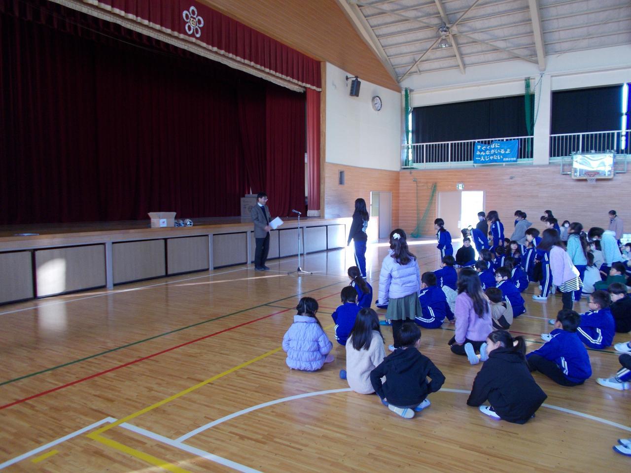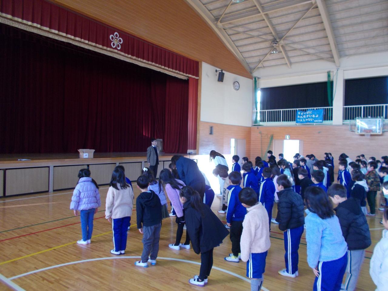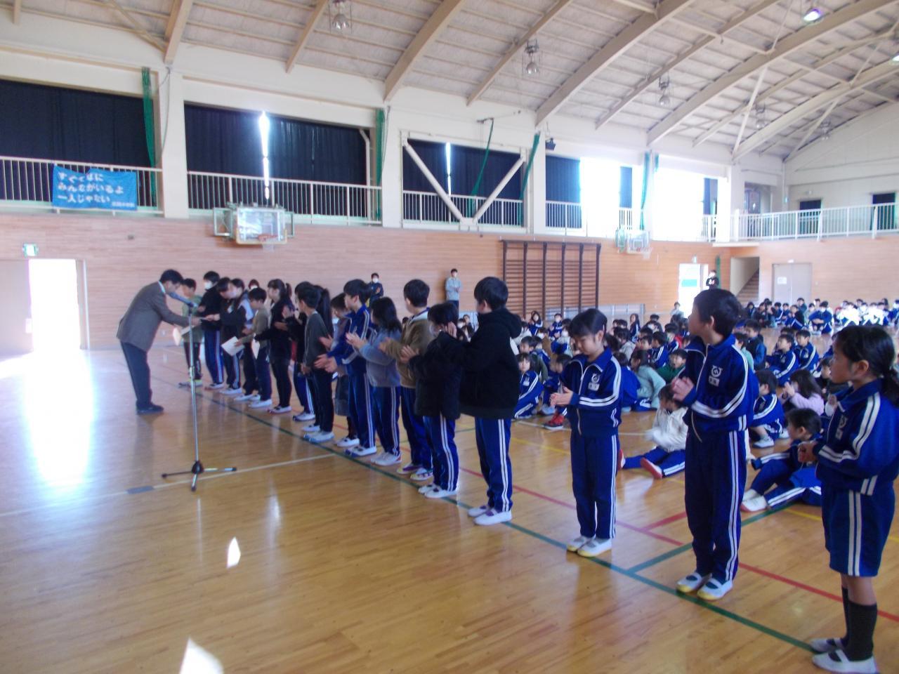 初めに全校生が校長先生と大きな声で元気よくあいさつをしました。