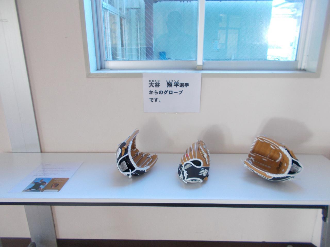 現在、グローブは児童玄関に大谷選手のメッセージとともにお披露目しています。たくさんの児童がタブレットで写真をとったり、実際に手にはめてみたりしています。