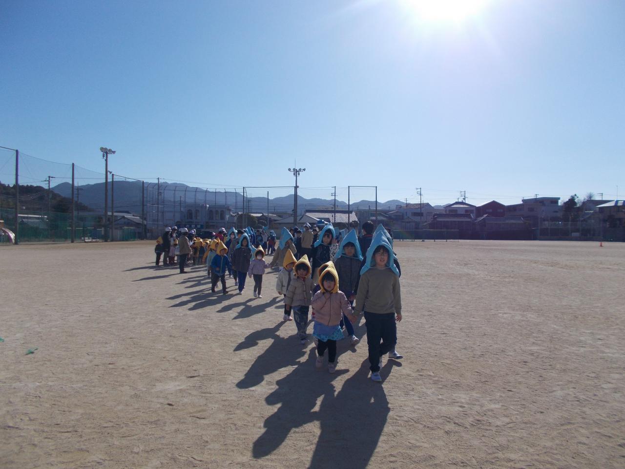 広田保育園から黄色の防災頭巾をかぶって避難しているところです。
