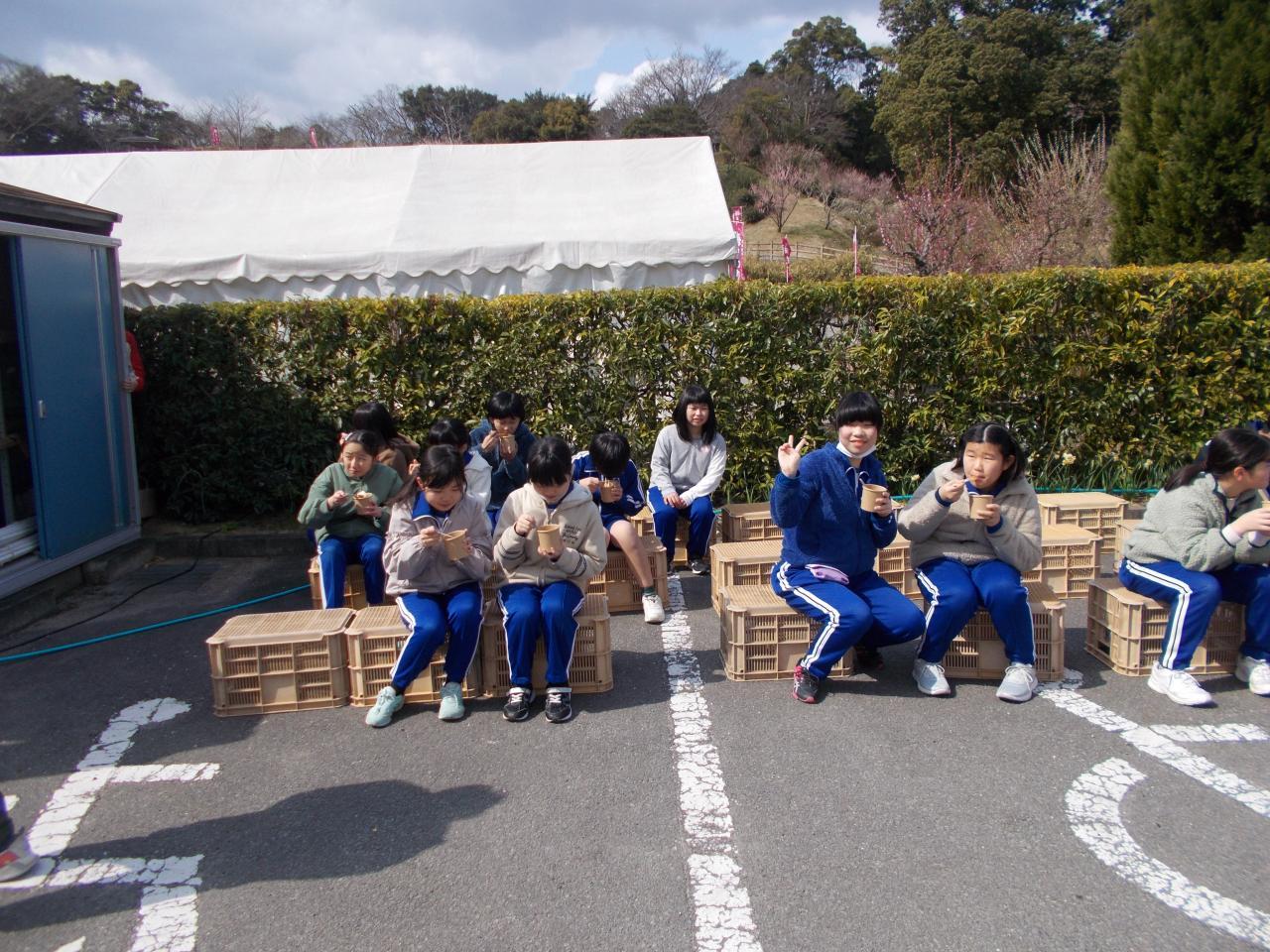 植樹のあと、ぜんざいをご馳走になりました。植樹の日は風が少し強く冷たかったですが、あったかいぜんざいをご馳走になり心も体も温まりました。