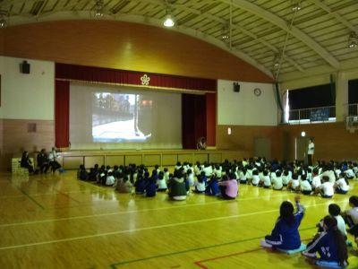 2校時は、体育館で、1~5年生が、交通安全についてのお話、DVDを視聴しました。