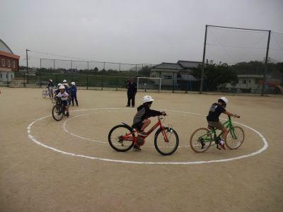 3校時は、運動場で、3年生が、コースを使って、自転車の乗り方を練習しました。