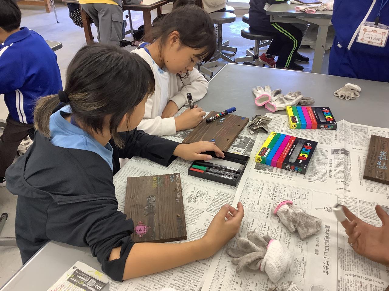 午前のプログラムは焼き板工芸です.板をバーナーであぶり、表面のコゲをとり絵を描いていきます.みんな自然学校の印象に残った場面を書いていました.