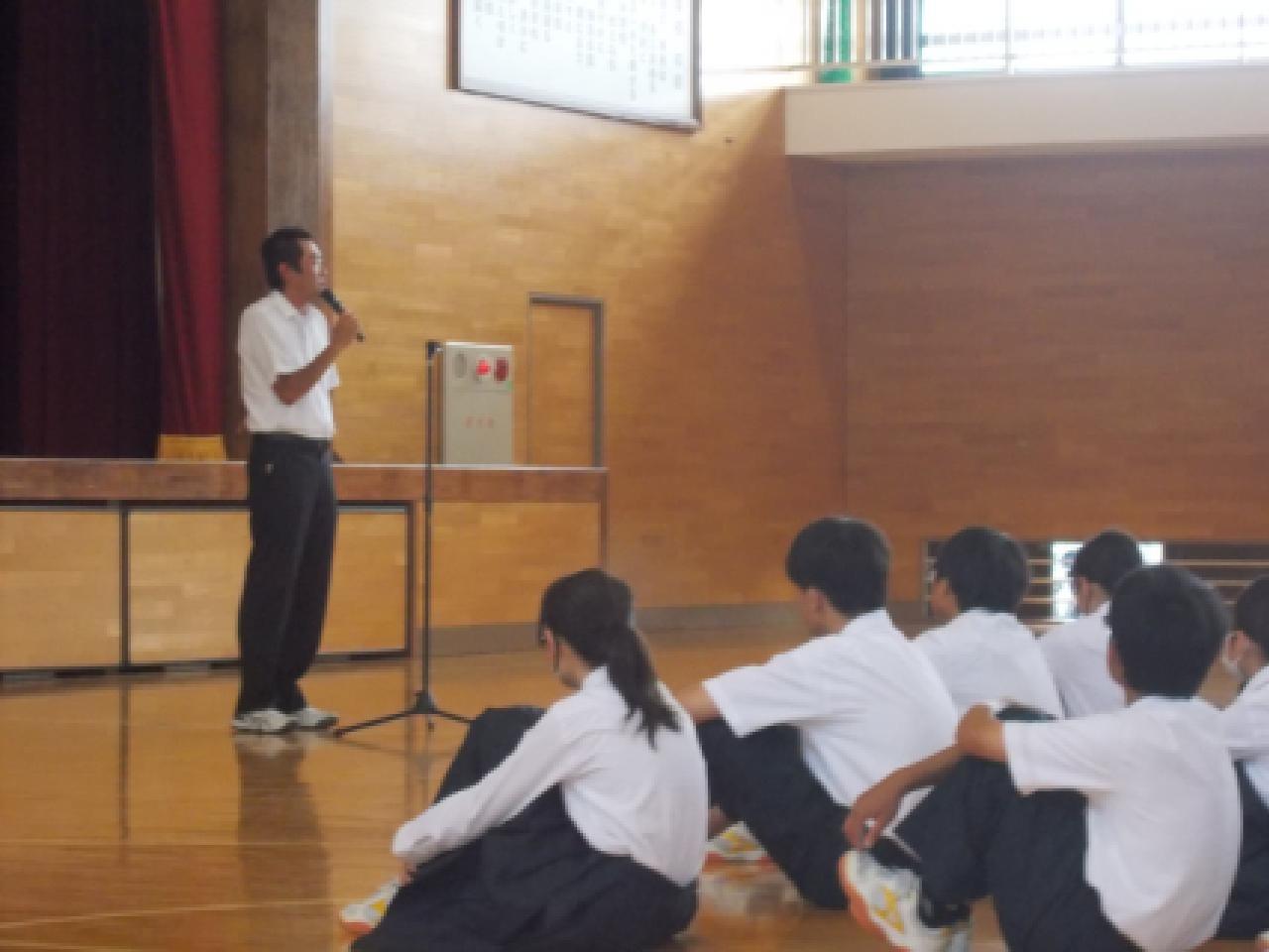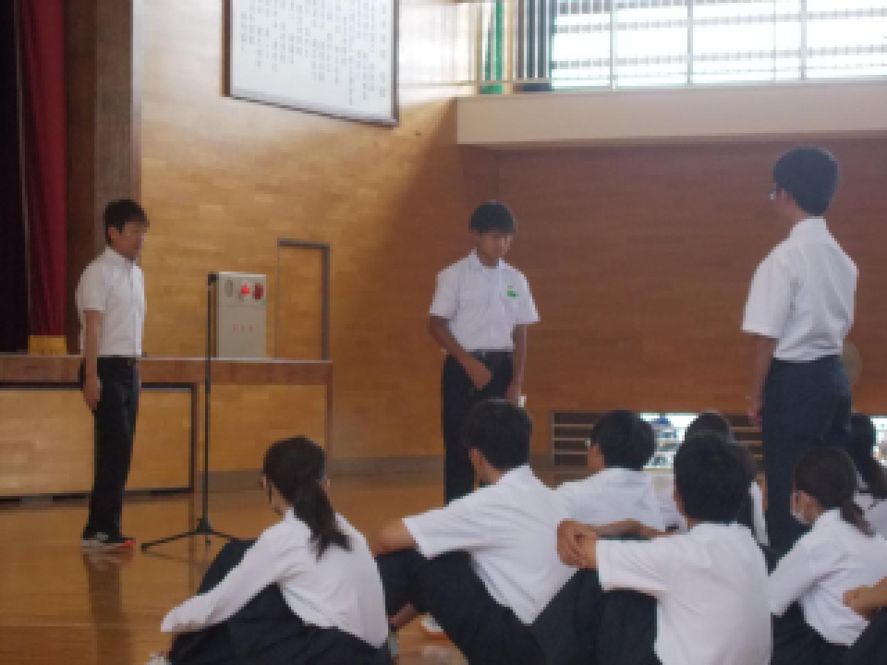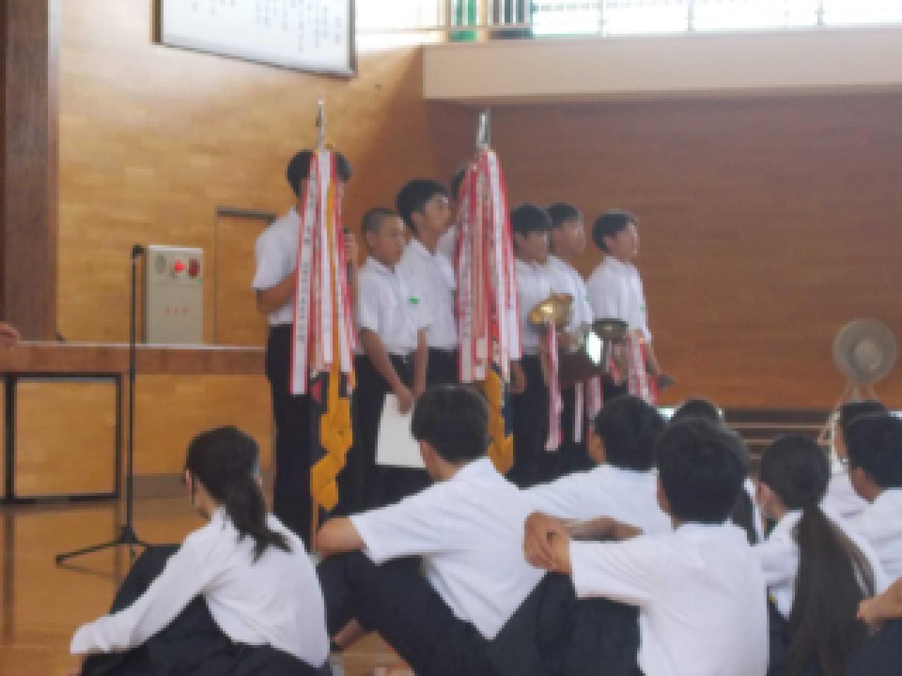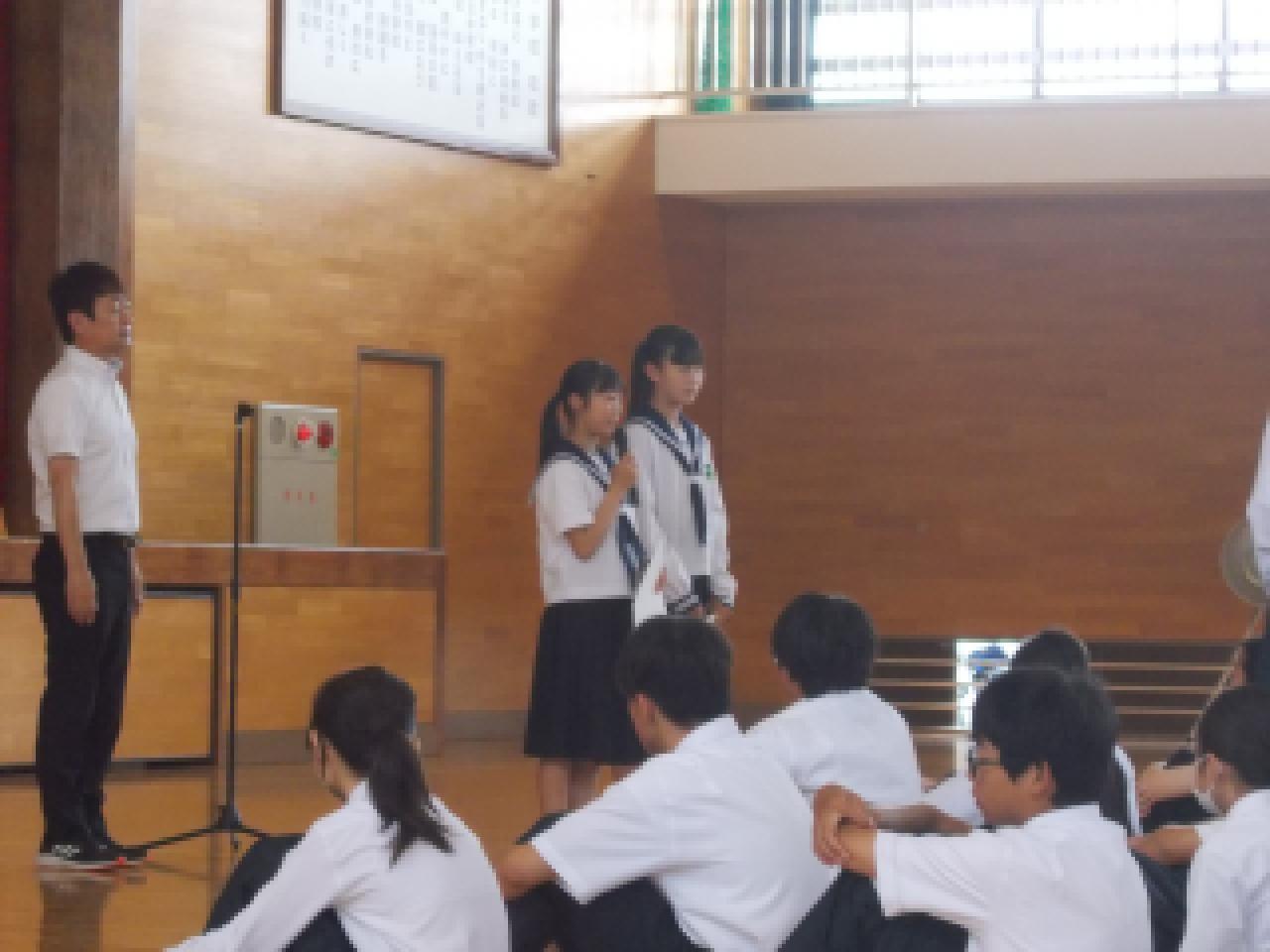 7月18日(金)、1学期終業式が行われました。学校長より「1学期いつも、いろいろなところで挨拶をしてくれてありがとうございます。また、まわりが気づかないところでも頑張ってくれた人たちにもお礼をいいたいと思います。明日から長い夏休みになります。昨日よりも今日が一段ステップアップできるよう努力していって下さい。」というお話がありました。その後、表彰伝達がありました。淡路総体で野球部優勝、サッカー部が準優勝、女子テニスが個人準優勝、女子バスケ部が優勝でした。県総体でも頑張ってきてくれると思います。最後に、生徒指導担当より、「命を大切にしてください。夏は車の交通量が多くなりますので、自転車にのる場合はベルメットの着用やルールをしっかりと守りましょう。そして、2学期も元気に登校してください」というお話がありました。
