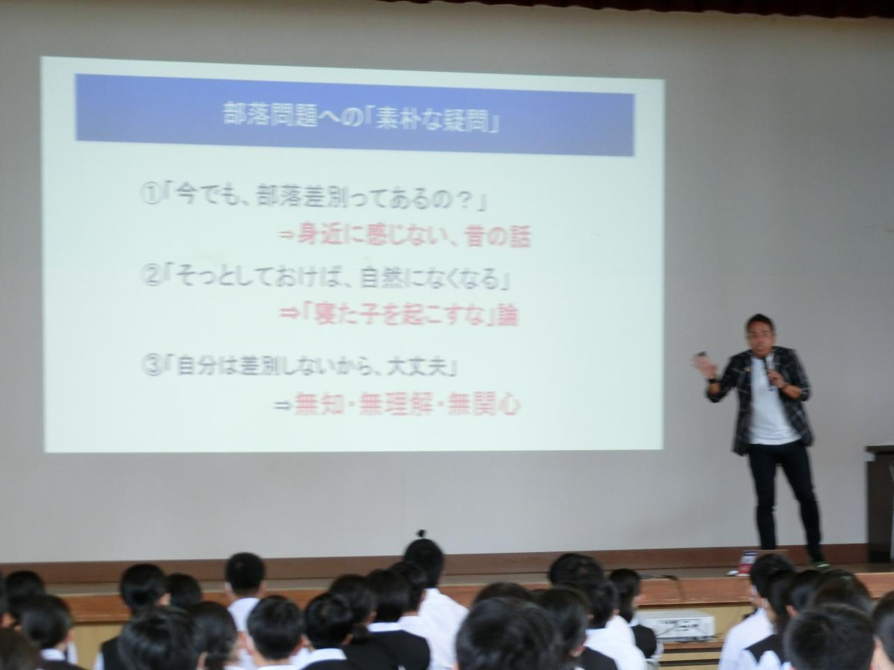 3,4時間目、山口県人権啓発センター事務局長の川口泰司さんをお迎えして、3年生に講演をしていただきました。現在の部落差別について、ご自身の体験談を赤裸々に語りながら、大変わかりやすく、熱意あるお話をしてくださいました。3年生は、長時間の講演にもかかわらず熱心に聴き入っており、質疑応答の時間には手を挙げて質問をしていました。