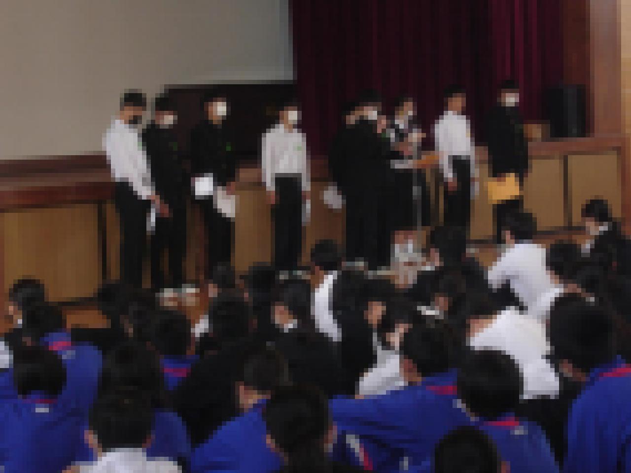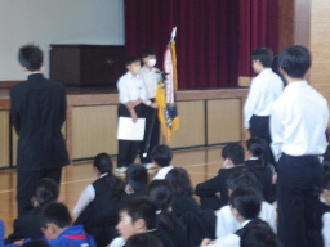 校長先生のお話のあと、生徒会、学級委員長、専門委員長の目標の発表がありました。5月は、テストやトライやる、修学旅行とそれぞれの学年で行事や活動があります。しっかりと取り組んでいきましょう。