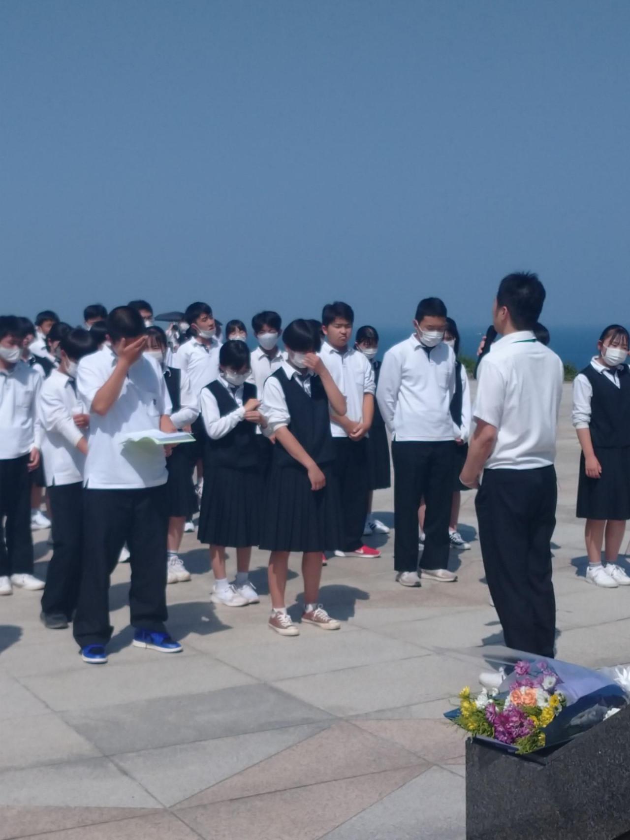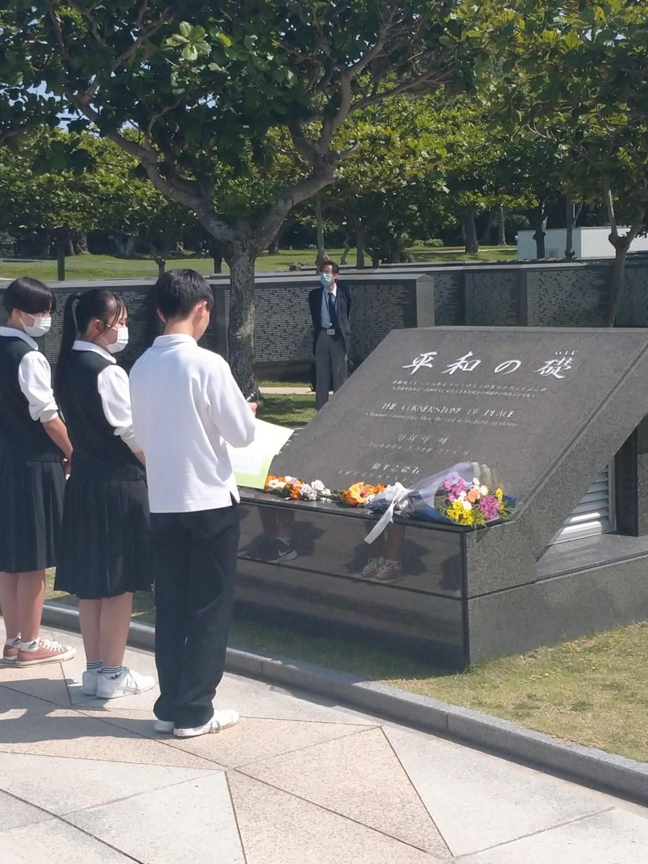 「沖縄県平和祈念公園」は、沖縄戦の最後の激戦地と言われる糸満市摩文仁にあります。「平和の礎(いしじ)」を前に、平和宣言と千羽鶴の奉納を行いました。