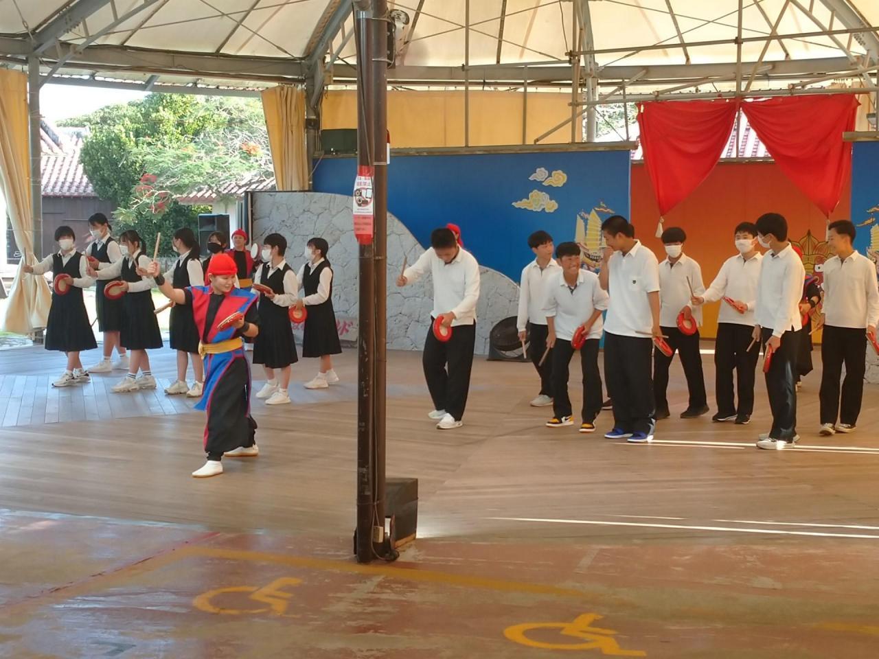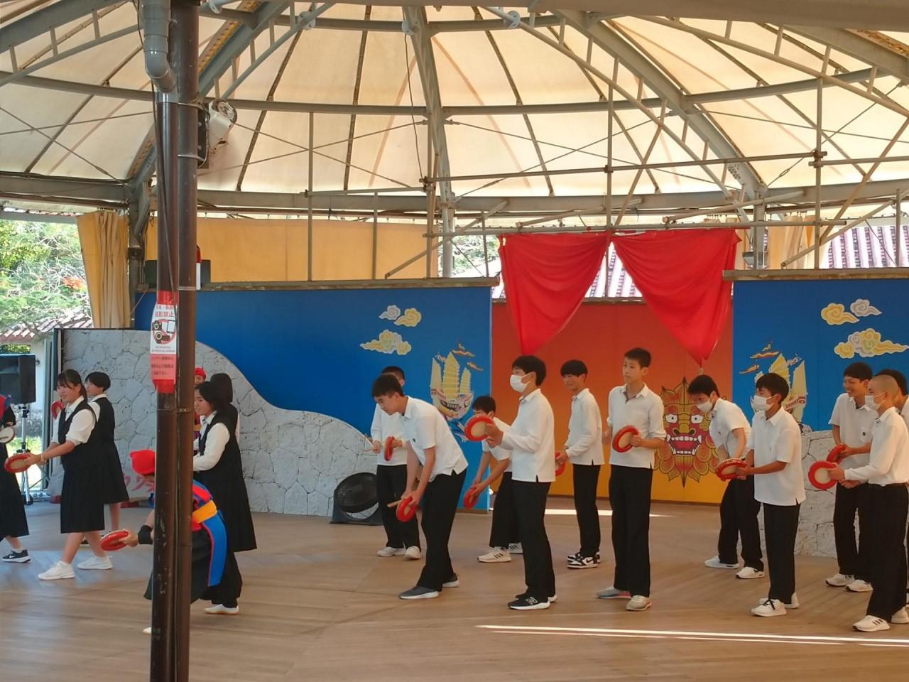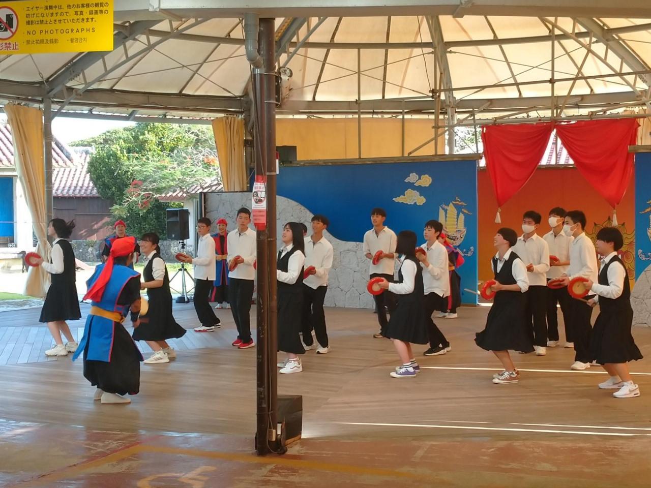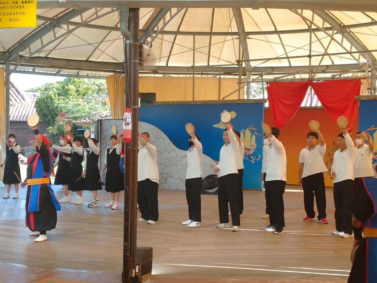 今日最後の訪問地は「おきなわワールド」。ここは沖縄の歴史や自然の営みを感じることができる施設です。みんなで沖縄の伝統芸能「エイサー」を体験し、それから夕食をとりました。