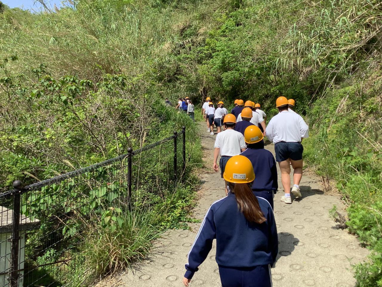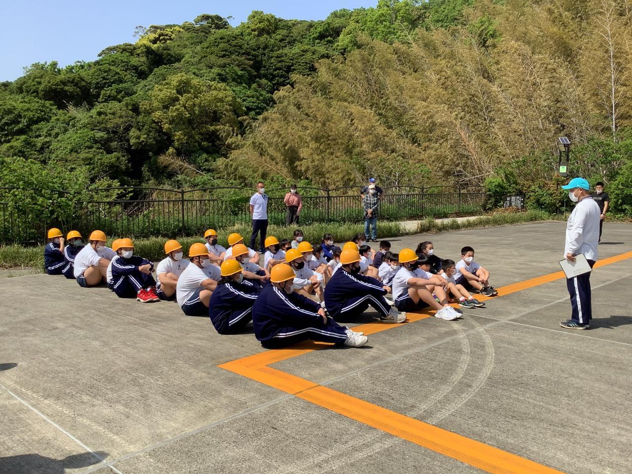 消火訓練が終わったあと、もう一つの避難経路を確認しました。それは、もし地震が発生し津波が沼島を襲った際に避難する場所の確認です。本校裏山にある1次避難所(海抜25m)と2次避難所(海抜45m)です。この高い台はヘリポートも兼ねています。地震が起これば、すぐ高台へ!