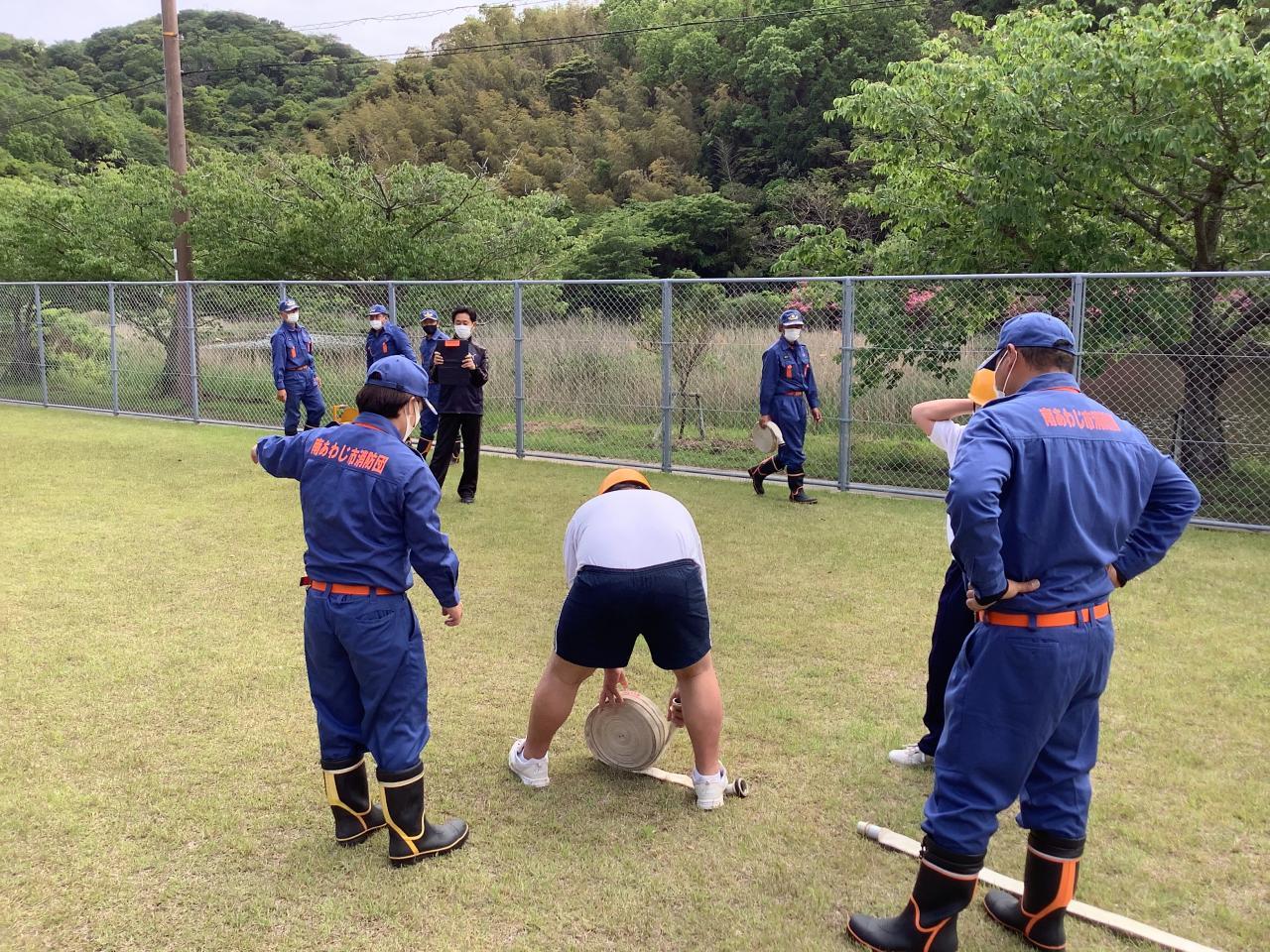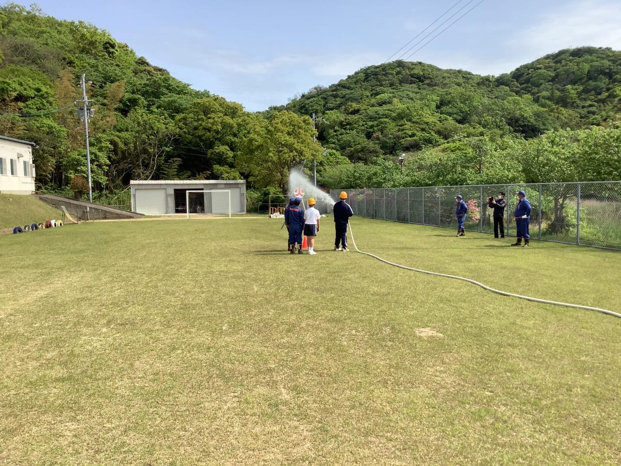 その後、沼島消防団による消火訓練を実施しました。生徒たちは、沼島消防団員の指示を受け、実際に消火栓からホースを連結させ、火点に水を当てました。消防団の操法大会さながらの訓練となりました。このような体験を重ねることで、有事の際、生徒たちが自分たち、地域のために力を発揮してくれると思います。沼島消防団の皆様、これからもお忙しいとは思いますがご指導よろしくお願いいたします。本日は本当にありがとうございました。