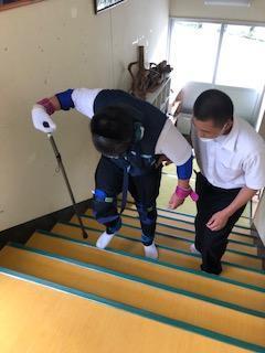 高齢者になりきった1年生たち。階段を上るのも一苦労。
