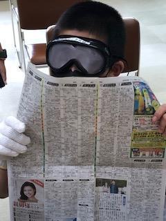 その状態で字を書いてみましたが、なかなか思うように書けません。また、先生が「今の状態で新聞が読めますか」と尋ねると、「読めます」と大きな声で返事していましたが、活字が読めても左の写真のようにかなり新聞に目を近づけなければ読めません。