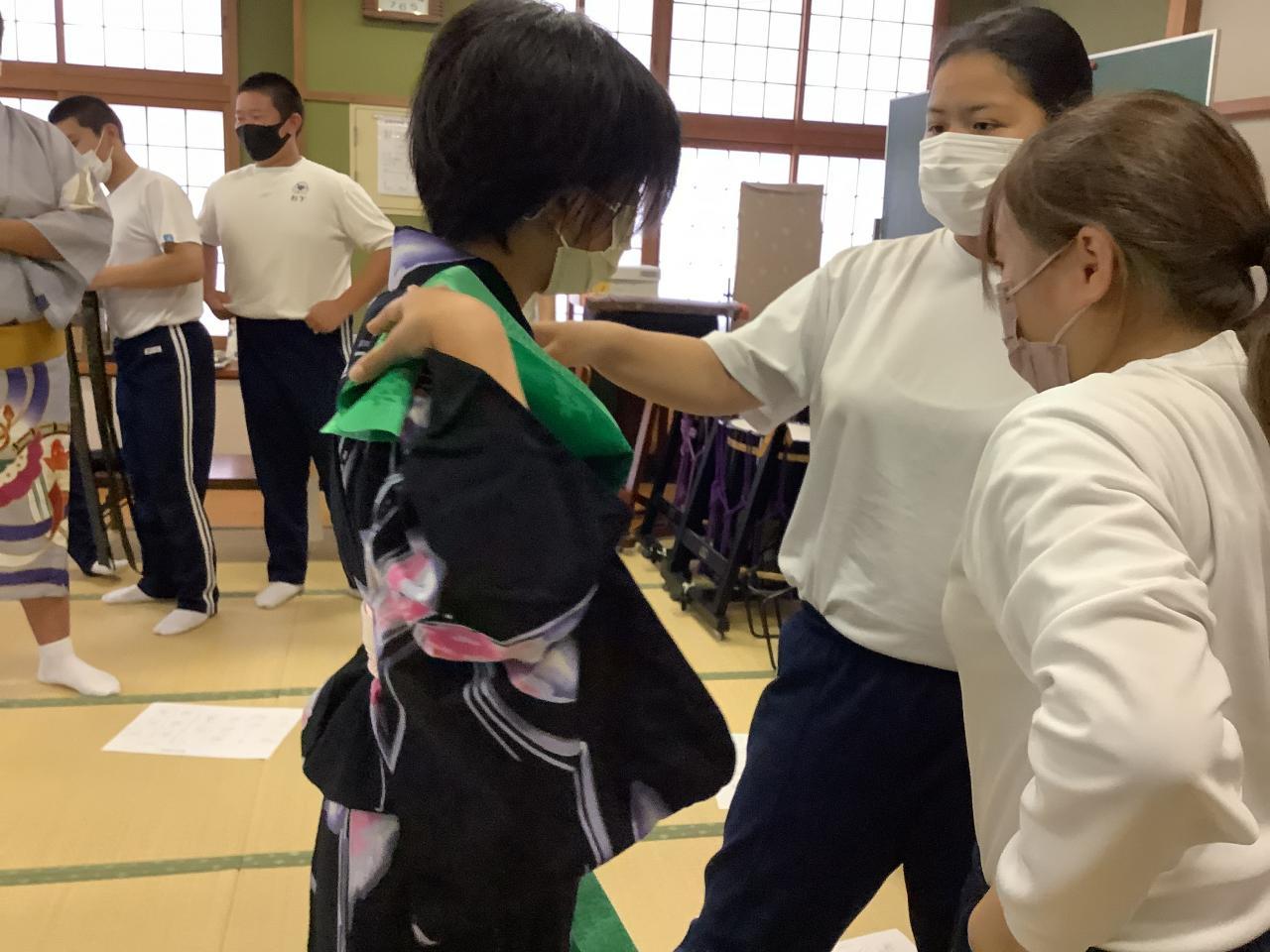 写真を見てわかるように、皆さん浴衣を着ています。そこで、校区の特色を生かし、実際に浴衣の着用に挑戦してみようということで、地域の方4名《学校支援ボランティア》をお招きし、浴衣着用の指導を仰ぎました。今の生徒たちは浴衣を着る機会が少ないのでとても興味をもって授業に参加できました。