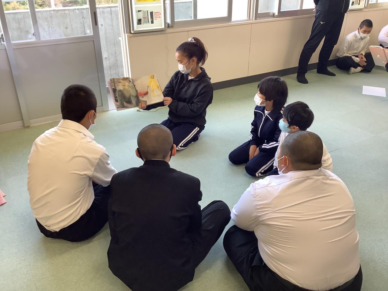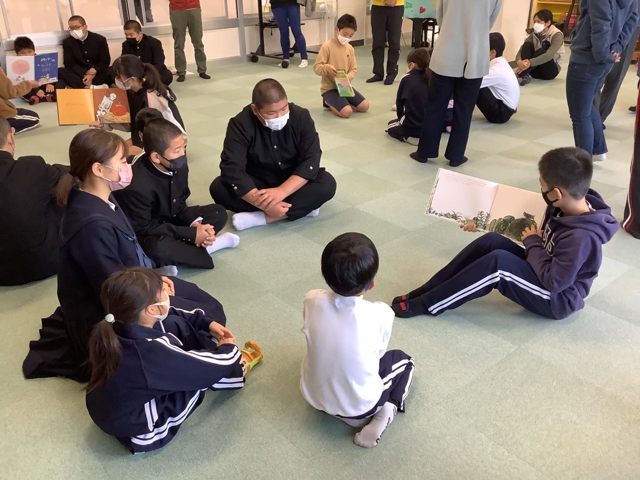 その後、班に分かれて絵本の読み聞かせをしました。今日は、小学生が中学生に絵本の読み聞かせをする番です。なかなか面白い試みです。今後も継続し小学生との交流を深めていきたい活動の一つです。小学生の読み聞かせは中学生に好評でした。