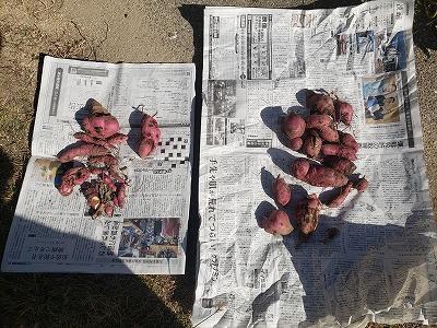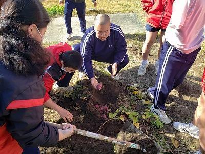 先日に一畝を掘って、今日は残りの畝の収穫でした。小学校でもやっていますが中学校でも技術科の教育課程の中で「栽培」(生物育成の技術)という単元があっての教育活動です。6月末に植えて、やっと12月半ばに収穫しました。今回は、植えるのも遅く、土も指が刺さらないほどカチカチでしたが、登校時の水やり当番そして過酷な夏は用務員さんに守られ何とか収穫までたどりついた結果です。私の全くの素人ですが、サツマイモは霜が下りる前に収穫と何かで読んでいたので、「今はもう土の中で腐って・・・」なんて思っていましたが、何とかみんなで楽しく収穫できました。来年は、夏野菜から挑戦だ!!(独り言・・・私の家庭菜園の収穫も散々だったので今年はダメな年?なんて思っていたら、用務員さんのご実家では例年通りの出来、そして、通勤途中のサツマイモ畑も大収穫でした・・・私が下手なだけ・・)