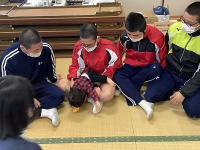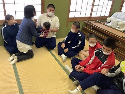 今日は家庭科で本校の坂本先生の息子さん(11か月)を講師先生として迎え幼児保育の学習をしました。ちっちゃい子の扱いに慣れている生徒、不安げにだっこする生徒、泣かれる生徒・・・でも、どの生徒も笑顔、笑顔・・・ちっちゃい子の笑顔は本当にみんなを笑顔にしてくれます。生徒達も、ちっちゃい頃はこうしてみんなを笑顔にしていたのでしょうね。「私のちっちゃかった頃、どうやった?」冬休みにでも写真(最近は現像せずデータかな)を見ながら、自分がちっちゃかった頃の愛の物語、命の物語を家族としてくださいね。