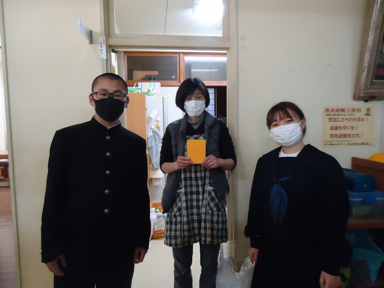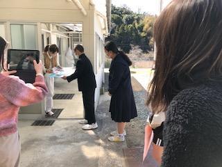 沼島地区の生徒たち3名は小学校1年生のときから9年間給食を作って貰いました。代表の生徒として沼島地区の生徒代表が「9年間おいしい給食を作ってくれて、ありがとうございました」と感謝の気持ちを伝えました。調理師さんからは「淋しくなるなあ。でも、元気に高校生活を送ってくださいね」と励ましのエールをいただきました。