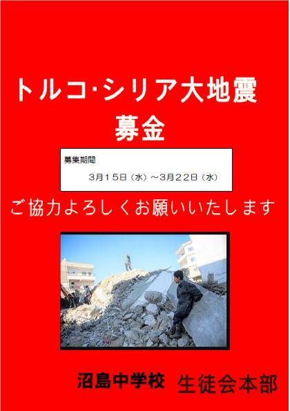沼島中学校生徒会では、南あわじ市の各校生徒会と連携してトルコ・シリア大地震募金を実施します。沼島内では、本部役員がセンター、漁協、気船場、中学校に募金箱の設置をお願いしました。ぜひご協力ください。なお、特認区の保護者様はお子さまを通じてご協力をお願いします。3/22まで短い期間ですがよろしくお願いします。