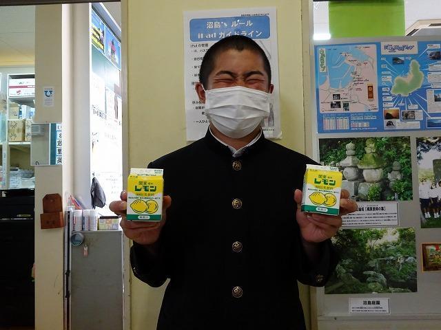 いよいよ、レモン牛乳です。レモン牛乳??検索すると「昭和の戦後まもなく誕生した乳飲料で、宇都宮市の関東牛乳が「関東レモン牛乳」の名称で発売していました。甘いものが貴重な時代、子供にとっては特別な日に給食などに出される贅沢品でもあったようです。一度は、惜しまれながら販売中止になったようですが、熱い復活要望に応え、再販売して大ブレーク」したそうです。本当かどうか検証していませんが、関西では買えないレアものだそうです。春休みに遠征でお世話になった国学院栃木中の先生が沼島中学校に送ってくれ、給食のときにおいしくいただきました。