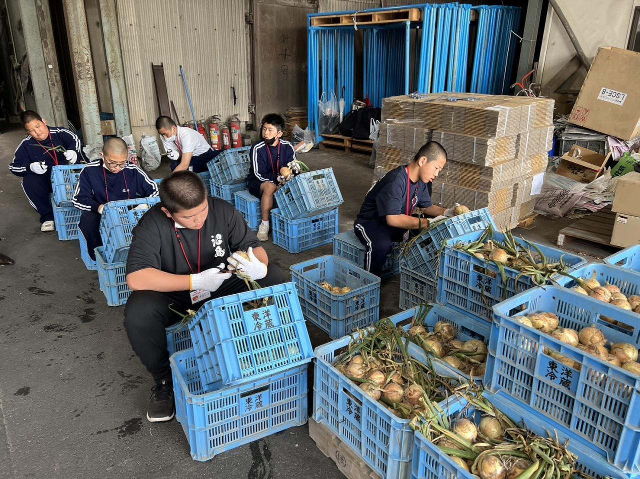 あいにくの雨で長靴を履いて、屋外での農作業とはならなかったけど、淡路名物の玉ねぎの作業をさせていただいていま~す。