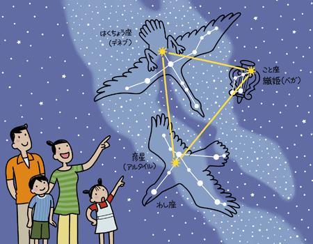 昔々、天の川の西岸に織姫という姫君が住んでいました。織姫は機織りの名手で、美しい布を織り上げては父親である天帝を大変喜ばせておりました。そんな娘の結婚相手を探していた天帝は、東岸に住む働き者の牛使い彦星を引き合わせ、二人はめでたく夫婦になりました。ところが、結婚してからというもの、二人は仕事もせずに仲睦まじくするばかり。これに怒った天帝が、天の川を隔てて二人を離れ離れにしてしまいました。しかし、悲しみに明け暮れる二人を不憫に思った天帝は、七夕の夜に限って二人が再会することを許しました。こうして二人は、天帝の命を受けたカササギの翼にのって天の川を渡り、年に一度の逢瀬をするようになったのです・・・