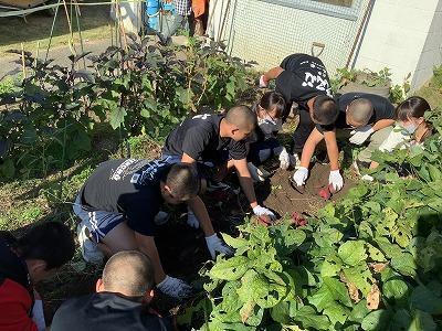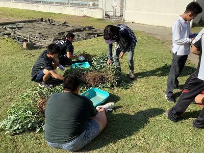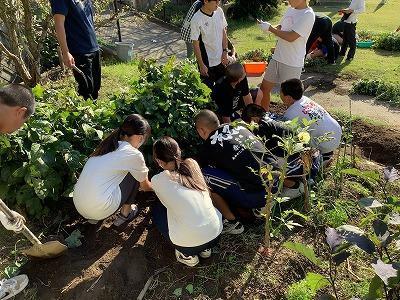 6校時は、全校生で春に植え付け生育記録をしっかりと残し、そして毎日の水やりして手塩にかけて育てた南京豆とサツマイモの収穫でした。ナス、キュウリ、オクラなど実がなるものは随時収穫してそれぞれが持ち帰って料理したり、してもらったりしてきました(ナスはまだ切り戻した枝からおいしい秋ナスが取れています)。今日は土中から大地の恵みをいただきました。なかなかの出来栄えで、ピーナッツ、お芋パーティ?が楽しみですね。