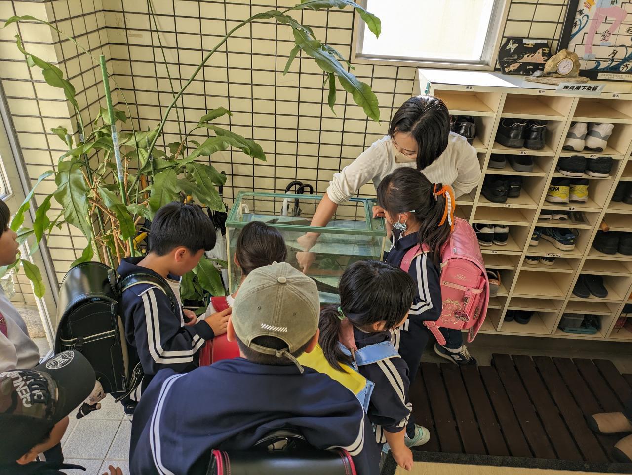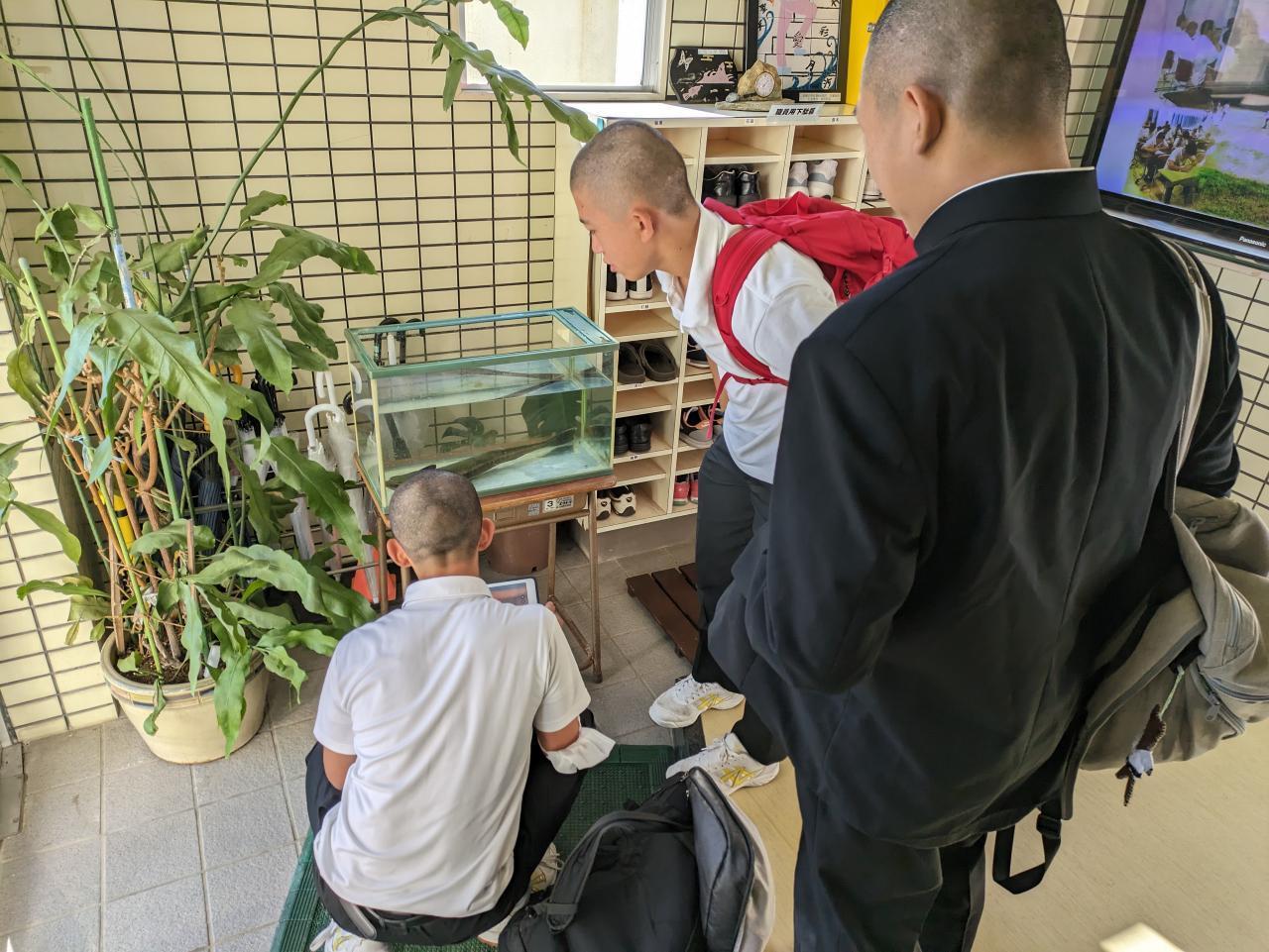小学校の保護者の中元さんさんが「珍しいから子どもに見せたって」と学校に持ってきてくれました。中学校で急遽、水槽を用意して水族館?を作りました。ほかの水族館でみる機会はありましたが、こんな間近で見るのははじめてです。授業を終えた中学生も小学生も興味津々でした(ただ中学生の中には冷めた感じの子もいたりして・・・好奇心は大切ですよ)小学生はわーわーきゃーきゃー言ってたのしんでいました。これも沼島ならではの学校風景です。中元さん、ありがとうございます