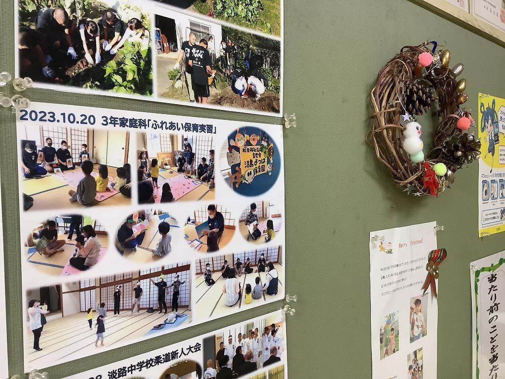 クリスマスリースは生徒玄関に飾ってあります(多分、沼島の強風で外に飾るとどこかへ行ってしまいそうで・・・)。いよいよ今週で2学期も終わりです。ぜっかくのイベントです。クリスマス、そして正月気分も盛り上がっていきましょう(その前に通知簿をもらいますねぇ。盛り下がったりして・・・)