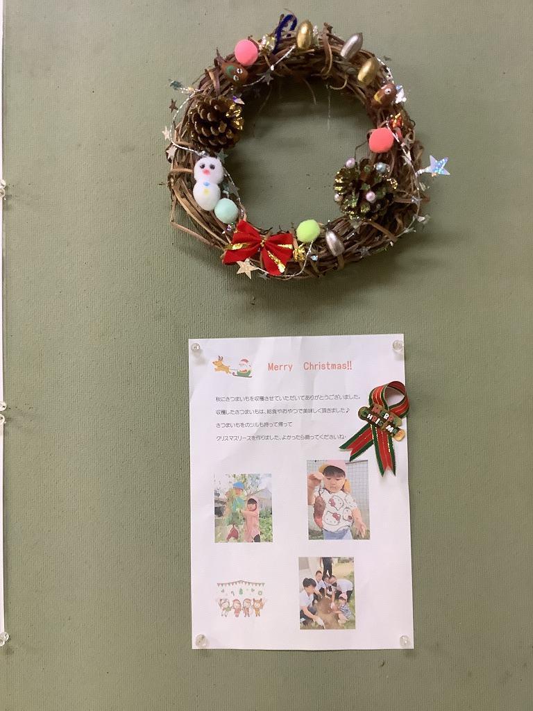 今日、よつば保育所から先生と一緒に2人のかわいいサンタがやってきました。一緒に掘ったサツマイモのツルを乾燥させて輪っかにして、ドングリを拾って色をぬって、そしてデコレイトして作ったクリスマスリースを届けてくれました。サツマイモのツルってこんな加工のしかたがあるのですね。また、来年も一緒にサツマイモを収穫しましょうね!!かわいいサンタさん、ありがとう!!