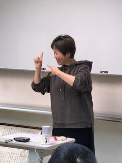さて、生まれたとき講師先生は聴力があったのですが、3歳の頃にでた高熱がきっかけで徐々に聴力を失っていったそうです。現在も感音性難聴で、雨が降っても雨音が聞こえず干してある洗濯物がびしょびしょになったり、冷蔵庫の扉が開きっぱなし(ピーという警報音)になっていても聞こえなかったり、日常生活でご苦労があられるようですが、そのようなご苦労されている素振りは一切見受けられません。講師先生の人柄でしょうか、常に笑顔で明るく振舞われ、話を聞いている私たちまで自然と笑顔になります。こんなにも明るい講師先生ですが、手話に出会うまでは暗い性格だったそうです。手話に出会い性格が変わったそうです。手話は魅力的だとおっしゃっていました。