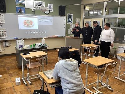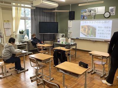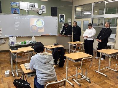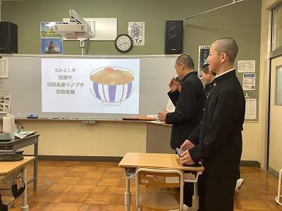 本日、2年生は「淡路食材を毎月、給食で食す」として、冬休みに考えてきた「1月は○○」・・・というメニューを小学校から栄養教諭の山田先生を迎え発表して、ご意見をいただきました。さすがに、日常から自炊する機会もある中学生です。現実的かつ面白い、楽しみなメニューを発表していました。しかし、給食として、準備できるかなぁというものもあったりで発表会は楽しかったです。今回、山田先生にいただいたご意見をもとに修正して再度、提案してくださいね。「沼島の給食はおいしい!!」で有名ですが、さらに毎月、「給食でこんなの食べられるって『うらやましい!』」と思われるメニューを考案してくださいね。