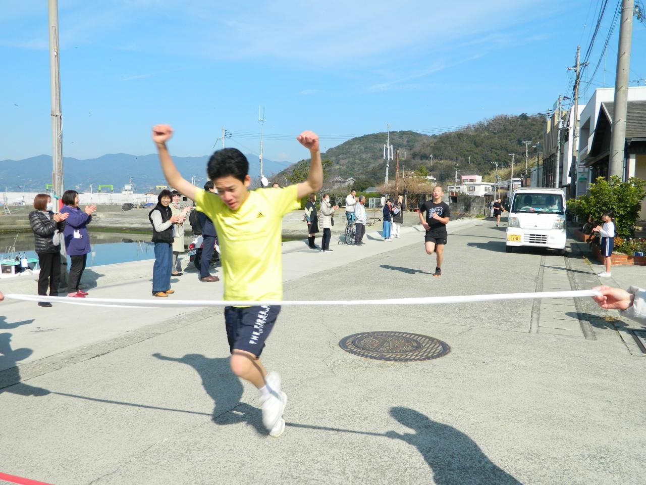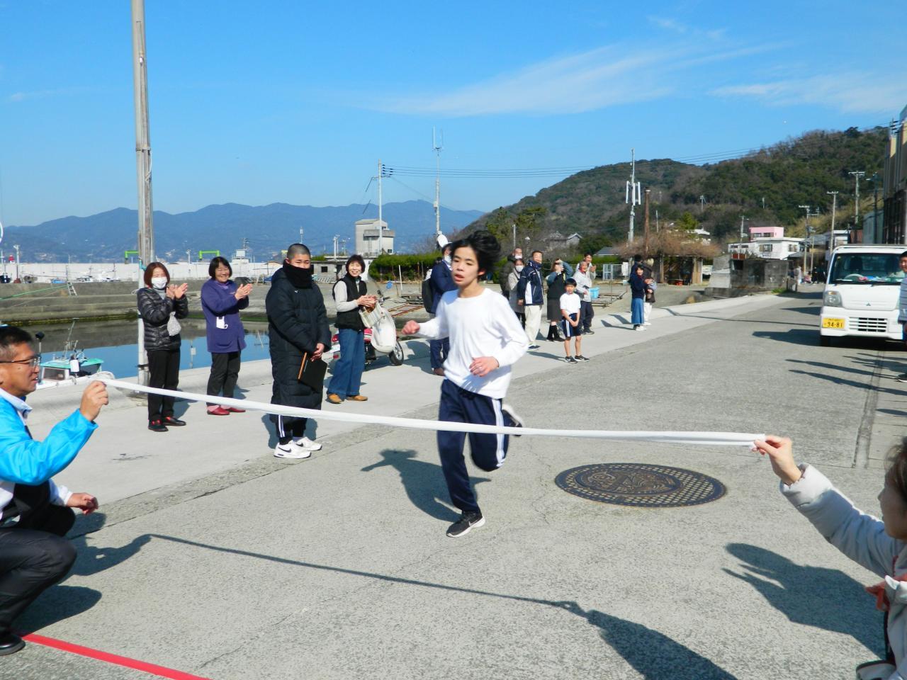 閉会式で沼島中学校生徒会長嶋本さんが心にしみる挨拶をしてくれました。「高橋尚子の元監督義雄さんの名言の中に『苦しい顔はしてもいいけど、嫌な顔はするなよ』があり、今日、私は走ることができなかったけれど、みんなの走りは観客の皆さんが応援したくなるような走りをしていました。これからの学校生活で苦しいことがあっても嫌な顔をせず前向きに生活していきましょう」と今日のマラソン大会のラストを締めくくってくれました。
