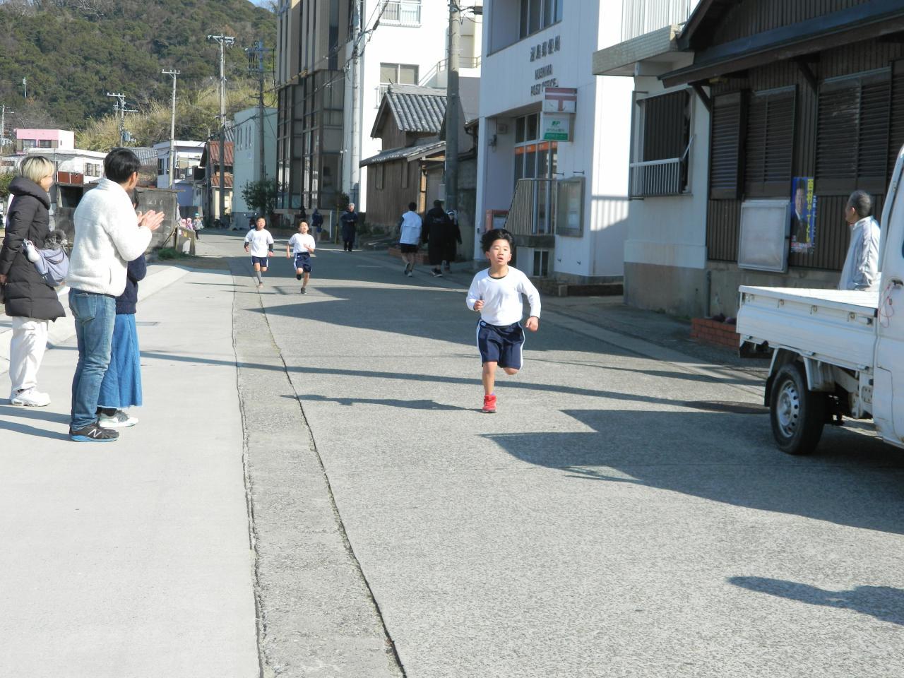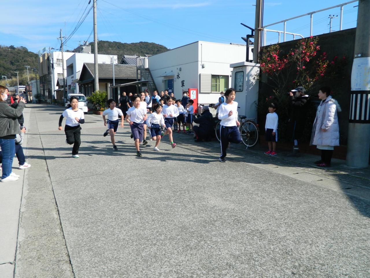 1月30日(火)。今日は、沼島小中学校校内マラソン大会の日。冬晴れのもと、午前11時、沼島八幡宮の宮下に号砲が響き渡り、小学校低学年の児童たちが(小学生低学年の部は1000m)がスタートしました。スタート前、児童たちはとても緊張していました。
