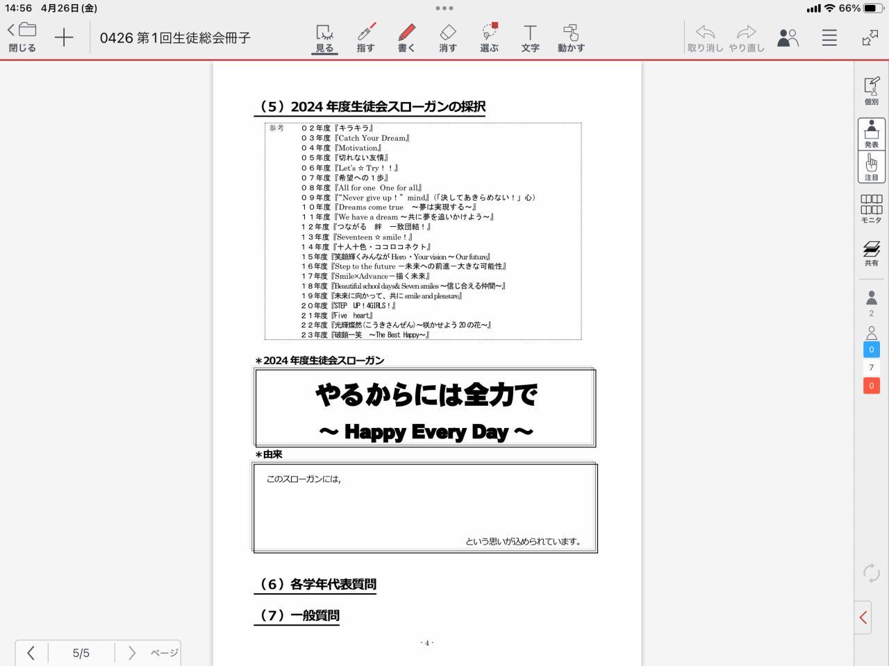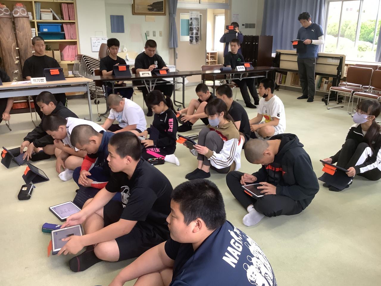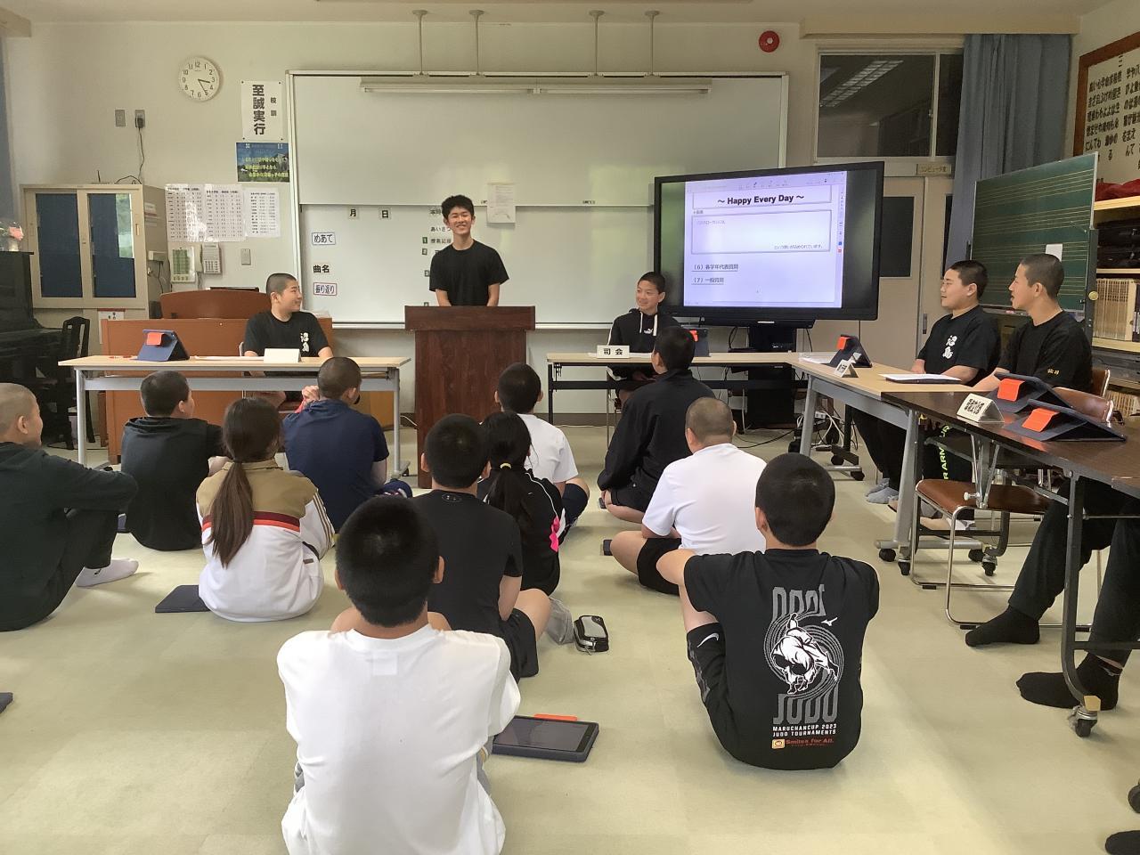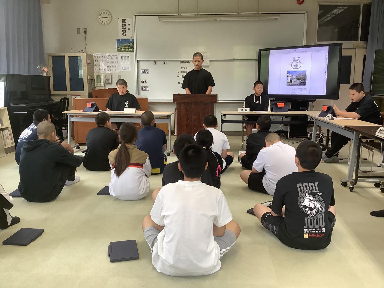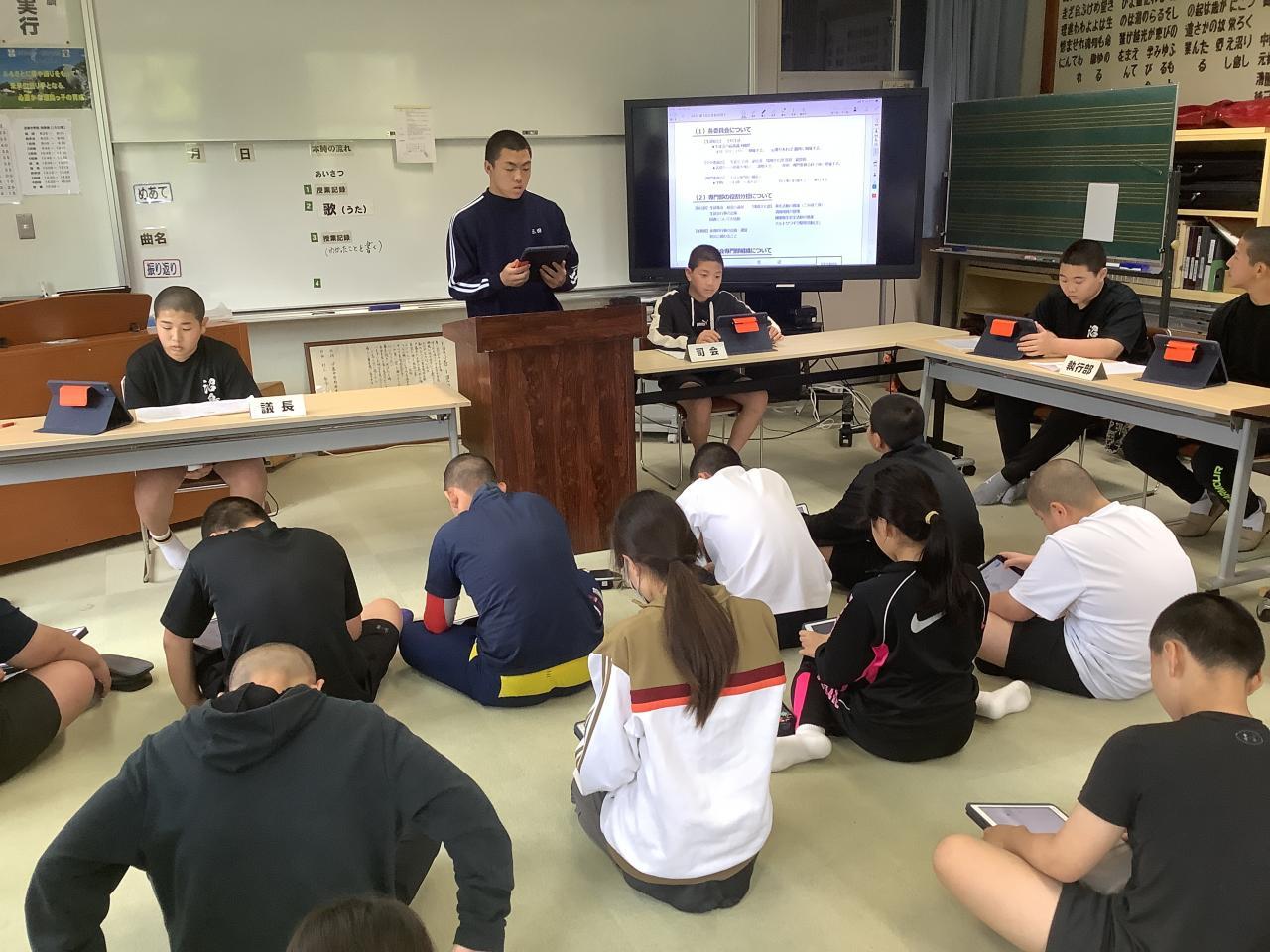 生徒総会ということで挨拶させてもらいました。私は生徒会会員ではないのですが、学校に関わることなので私の出番となりました。「マナーがないからルールを作った」というタバコのポイ捨て条例ができた時の東京都のある区長の話から始めて、社会生活、集団生活をするうえでどの集団にもルールがあり、それを義務教育段階で「守る」という学びのために校則ってあるんだよと話をすすめました。そして、「ルールは(とんな変なルールでも)ある以上は守らないといけない。でもルールは変えられる」そして「変えるにはどうすればいいのか」という話をさせてもらいました。今は社会的にも、沼島中的でも「変えられる」時期です。いろいろみんなで討議してみましょう。(そういえば古い修学旅行のしおりが出てきて「旅行カバンの色はピンクは禁止」という意味不明のルールがありました・・・)