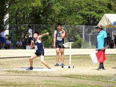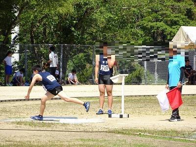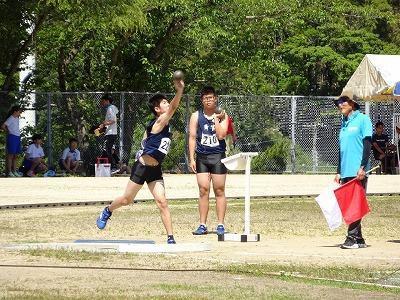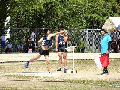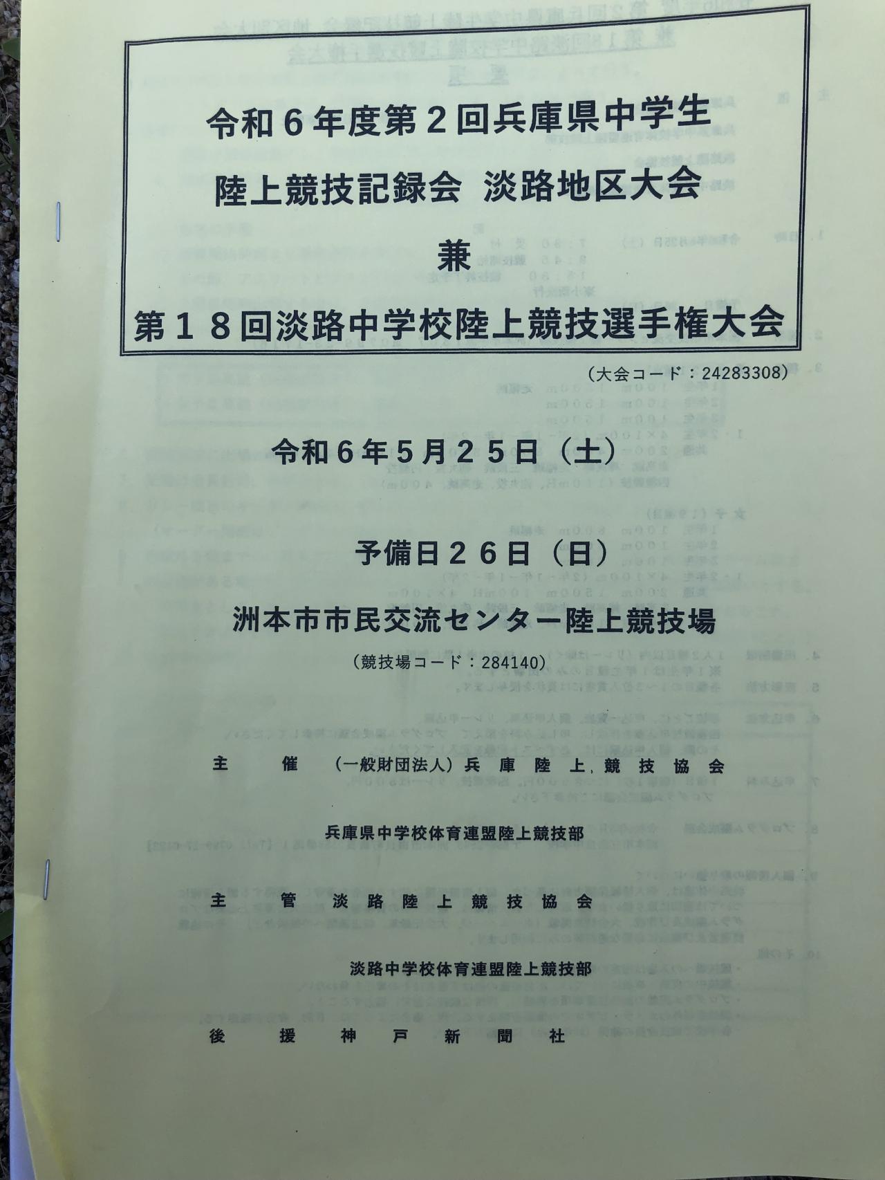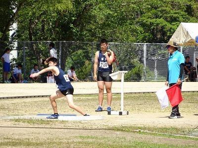 5月25日(土)。五月晴れのもと、洲本市民交流センター陸上競技場で淡路中学校陸上競技選手権大会が開催されています。本校から平田選手が砲丸と円盤投げにエントリーしています。