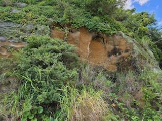 下の写真は現在も理科の教科書に載っている地層の一部です。以前に比べ、随分と地層は風化し草木が生い茂ってしまいました。