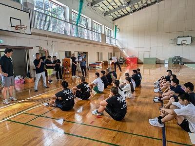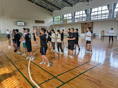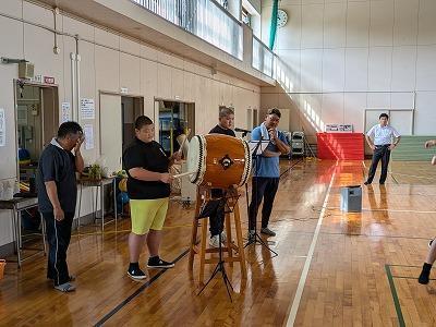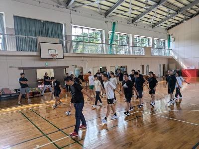 今年も沼島伝統文化保存会のみなさんの協力を得て沼島中学校全校生で沼島音頭に取り組んでいます。1学期の座学から今日は体育館で一通り踊れる様子を見学させていただきました。まだまだ完成途中ですが、太鼓に合わせて楽しそうに踊る生徒、指先、足さばきが美しい生徒と楽しみはいっぱいです。まだ、掛け合わせの声はまだまだですが、踊りに自信をもってもっともっと楽しみだしたら自然と声も大きくなるものと期待しています。10/8の敬老会が初舞台になります。皆が笑顔になる、元気になる音頭を頼みますよ