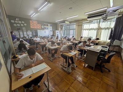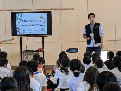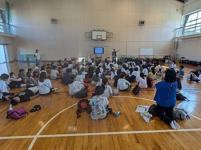 そのころ体育館では、淡路市の複数小学校の5年生が自然学校で沼島を訪れ、防災学習をしていました。兵庫県の震災・学校支援チームの隊員でもある本校の河野先生が講師を努めました。講義の中で使った映像資料を使って本校の生徒は授業中に学習しました。わたしは、初めて見たのですが、南海トラフ地震発災時に沼島に想定される事態について具体的にイメージを持つことができました。集会で映像も見せてもらいましたが、河野先生は、EARTH隊員として1/1の能登半島地震後、すぐに27日から支援活動に行く珠洲市に派遣されています。当時の様子をしっかり聞いて、自分たちが見る今の珠洲市の様子をしっかりと目に焼き付けてきましょうね。
