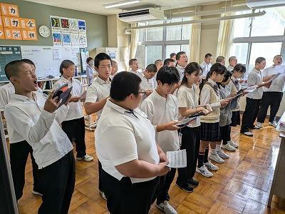 「友~・・・」と校舎に歌声が響き渡っています。様子を見に行くと本当に「いい顔」で気持ちよく歌っている姿を見ることができました。こちらも思わず「笑み」が浮かべてしまいます。音響の悪い体育館でどれだけ声を響かせることができるか。そして、この歌詞にどんな思いを込めることができるか、どんな思いを受け取ることができるか・・・