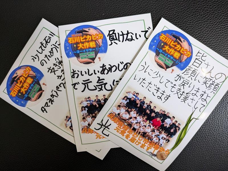 いよいよ出発まで10日を切りました。「能登半島の友」へ届けるためにメッセージカードをみんなで1枚1枚書いています。小中合わせて110枚以上のメッセージを南あわじブランド玉ねぎに添えて届けます。保護者の方々、地域の方々、募金等のご協力ありがとうございました。沼島小中学校の児童生徒が沼島を南あわじを代表して届けてきます