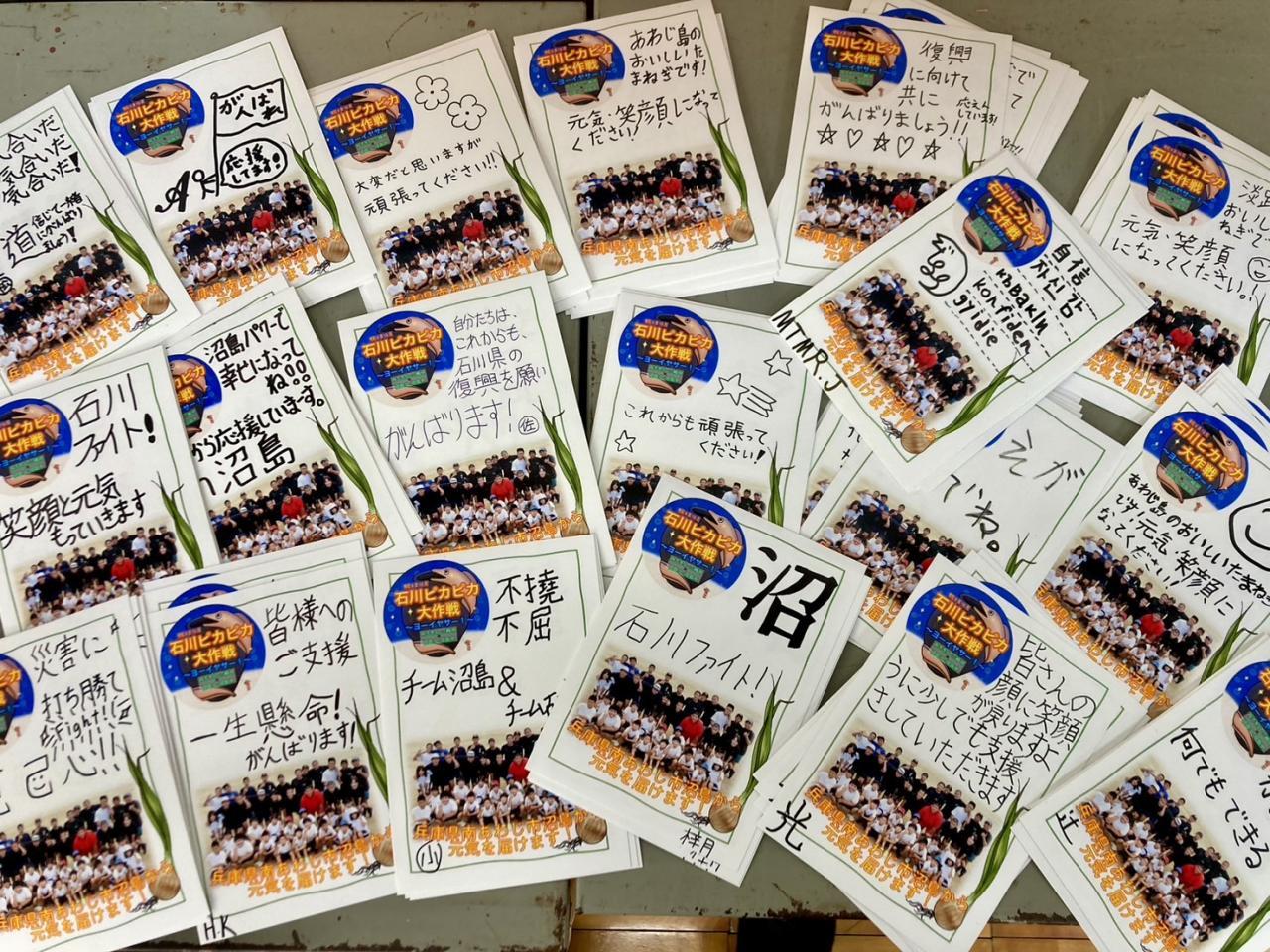 いよいよ能登半島地震豪雨災害支援交流事業「沼島から元気を届けたい!!」の出発まで1週間となりました。先日も数枚の激励メッセージカードを紹介しましたが、児童生徒が力を合わせて120枚以上の激励メッセージを書きました。明日から福良の寮で南あわじブランド玉ねぎをネット詰めしていきます。そこに沼島小中からのメッセージを添えて、珠洲市立三崎中・みさき小グラウンドで今なお仮設住宅で不自由な生活を送っている珠洲市のみなさんに届けます。