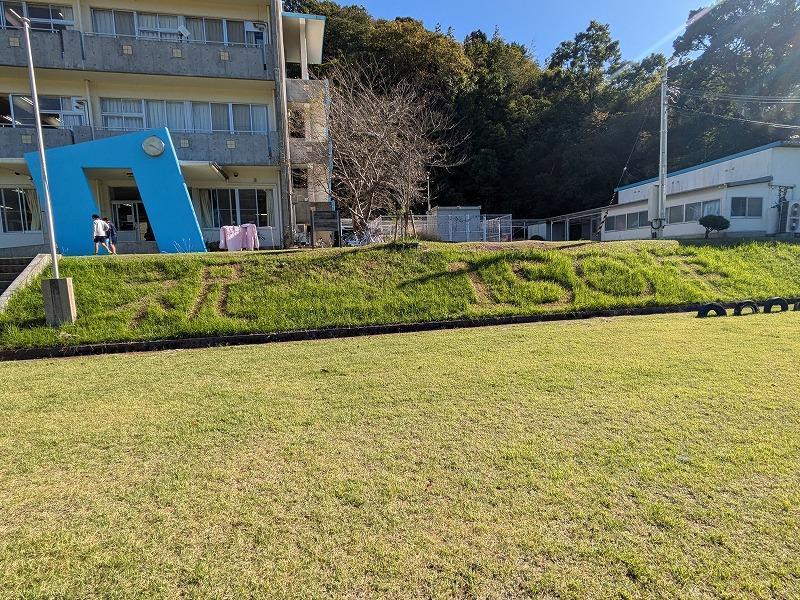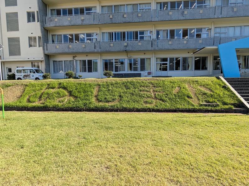 明日、沼島小学校創立150周年を祝して人文字をつくり航空写真を撮ります。飛来時刻は11:29ということです。中学生も人文字には入りませんが「にぎやかし」に写真に写りこみに行く予定です。中学校は令和6年で創立80周年です。100周年まで後20年・・・そのとき沼島小中学校は一貫教育校からさらに一歩進み義務教育学校「沼島(仮称)」となっているのでしょうか・・・楽しみですね! 下は小学校前斜面に草刈り機で「ぬしま小 祝 150年」とアートしてくれました。お上手!!