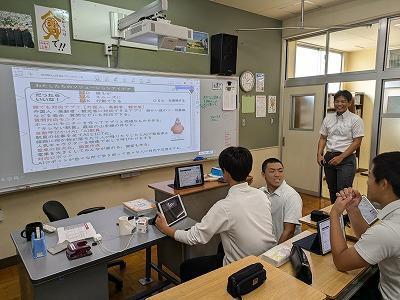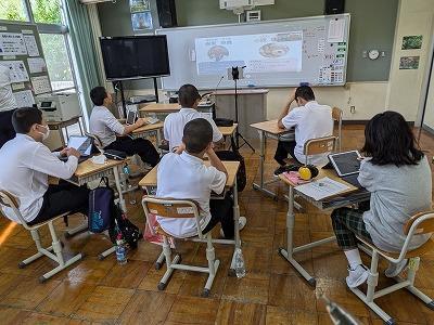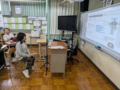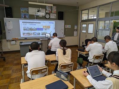 富士通さんがファシリテーターとして、千葉県成田市立西中学校と富山県富山市立八尾(やつお)中学校と沼島中学校をつないでそれぞれの「だったらいいな」のアイデアを発表しあいました。3年生の作ったビジュアルを生かしたプレゼン資料は「高評価」でした。紙媒体では効果的にはなかなか難しいところですがタブレットの利点をうまく生かしています。