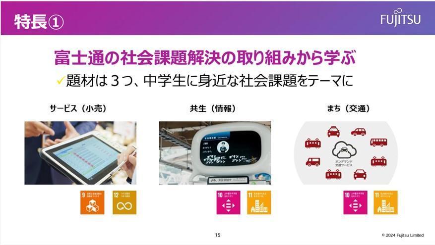 デザイン思考で考えるSDGsプログラムは、富士通が商品開発や社会課題解決に活用しているデザイン思考(※)を使って、「その人のだったらいいな」を考え解決方法を模索していきます。テーマとなる3つの社会課題にじっくり向き合い、課題解決を考えます。学校現場で求められている「社会のつながり」を学びながら、未来の社会を創造する力を養うことができます。キャリア教育に力をいれる沼島中学校は今年も参加させていただきました。
