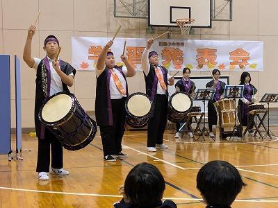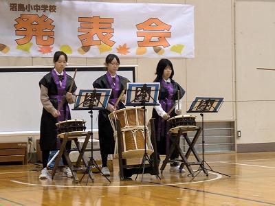 1年生、2年生は筝に挑戦しました。慣れない和楽器です。苦戦したとは思いますが、本日も応援に来てくれた狩野先生の指導もと披露することができました。努力の跡がみられました。3年生の和太鼓については、ソロやパフォーマンスありなのに予行のときは「なんでそんなに中途半端にやるの、カッコ悪いよ」と思って言いましたが、今日の3年生は違いました。静と動、停止と躍動のメリハリがついていて格好いい演奏でした。沼島中学習発表会の良き伝統として下級生につなぐことができたのではないでしょうか